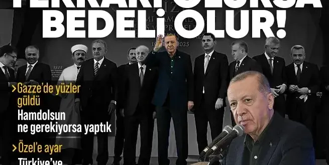 Başkan Recep Tayyip Erdoğan, Rize’de Yapımı Tamamlanan Tesis ve Projelerin Toplu Açılış Töreni’nde önemli açıklamalarda bulundu. Gazze’de 2 yıl sonra yüzlerin güldüğünü belirten Başkan Erdoğan, ateşkesi memnuniyetle karşıladıklarını söyledi. Gazze için ne gerekiyorsa yaptıklarını ifade eden Başkan Erdoğan İsrail’i “Soykırımın tekrarı olursa bedeli ağır olur” diyerek uyardı.