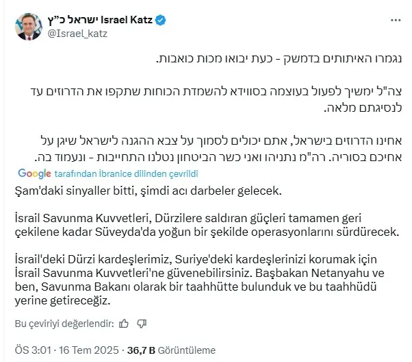 İsrail’deki Dürzilere seslenen Katz, “Suriye’deki kardeşlerinizi korumak için İsrail ordusuna güvenebilirsiniz.” diyerek, İsrail Başbakanı Binyamin Netanyahu ile birlikte “Dürzileri koruma” taahhütlerini yerine getireceklerini iddia etti.