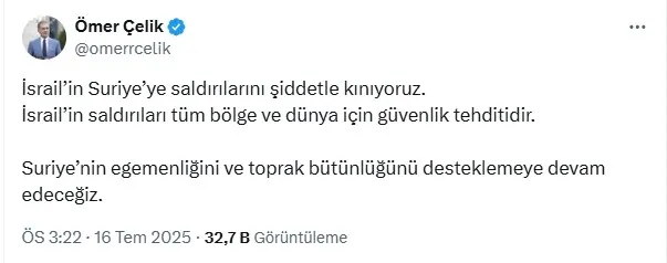 AK Parti Sözcüsü Ömer Çelik, “İsrail’in Suriye’ye saldırılarını şiddetle kınıyoruz. İsrail’in saldırıları tüm bölge ve dünya için güvenlik tehditidir. Suriye’nin egemenliğini ve toprak bütünlüğünü desteklemeye devam edeceğiz.” ifadelerini kullandı.