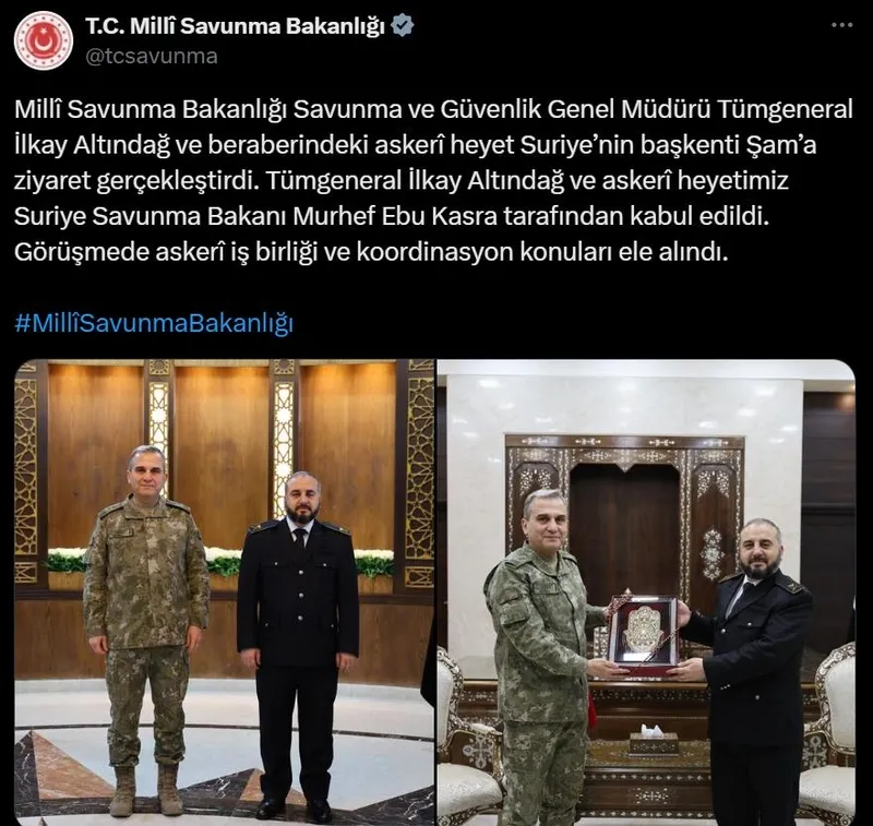 Şam’a yapılan askeri düzeydeki ziyaretin fotoğraflarını paylaşan MSB, “Milli Savunma Bakanlığı Savunma ve Güvenlik Genel Müdürü Tümgeneral İlkay Altındağ ve beraberindeki askeri heyet Suriye’nin başkenti Şam’a ziyaret gerçekleştirdi. Tümgeneral İlkay Altındağ ve askeri heyetimiz Suriye Savunma Bakanı Murhef Ebu Kasra tarafından kabul edildi. Görüşmede askerî iş birliği ve koordinasyon konuları ele alındı.” ifadelerini kullandı.